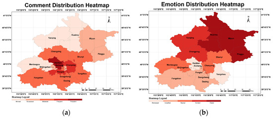 Prior to examining sentiment patterns, we analyzed the spatial distribution of user review data across Beijing’s districts to establish the statistical foundation for subsequent sentiment analysis. Crucially, all spatial analyses utilize the original, unmodified data distribution to preserve authentic user feedback patterns and ensure ecological validity of our findings, maintaining the natural sentiment distribution observed in real-world charging infrastructure usage. Figure 8a presents the comment distribution heatmap, revealing significant spatial heterogeneity in user engagement levels across the metropolitan area.