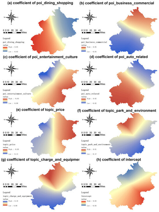 To investigate spatial heterogeneity in factors influencing negative sentiment, we employed geographically weighted regression (GWR) analysis using the original, unbalanced sentiment data distribution to ensure authentic spatial patterns. After ordinary least squares analysis and variable screening, we finally identified seven predictive variables, as follows: POI densities for dining/shopping, entertainment/culture, auto-related services, and business/commercial areas, plus review topics related to price, parking/environment, and charging equipment. The GWR model employed adaptive kernel functions with AICc optimization to balance model fit and complexity.