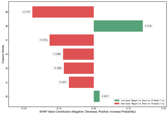 SHAP waterfall plot for individual sample analysis. The plot shows how each feature (word) contributes positively (green) or negatively (red) to the model’s sentiment prediction.