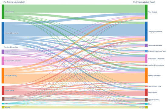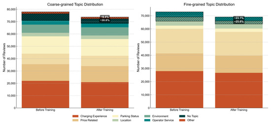 As demonstrated in Figure 15, the model is capable of systematically reallocating previously discarded data points into actionable feedback categories. This transformation represents the recovery of lost customer insights, which has a direct impact on charging infrastructure planning. Comments initially considered to be “noise” were found to contain valuable feedback on specific aspects of charging infrastructure that could not be classified by human annotators.