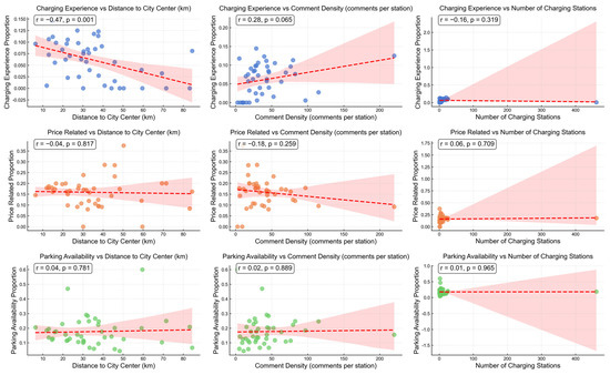 Furthermore, a weak correlation was identified between comment density and issue proportion, with charging experience demonstrating the strongest correlation (r = 0.26, p = 0.065), although this remained below traditional significance thresholds. In addition, the number of charging stations within a region has a negligible impact on issue distribution, with all correlations approaching zero. This finding challenges traditional assumptions about infrastructure saturation, suggesting that merely increasing the number of charging stations may not address users’ specific needs and that service quality outweighs quantity. This supports a shift from expansion-oriented development to upgrading existing infrastructure with an emphasis on user experience.