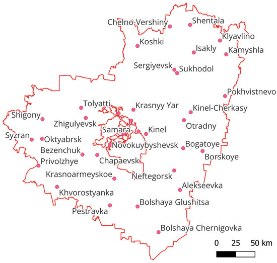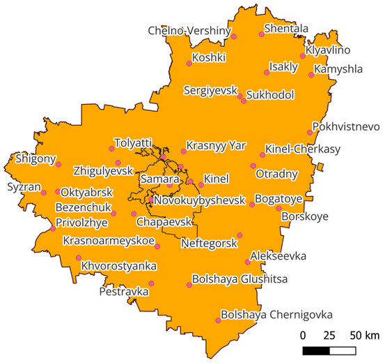 This study was conducted in the Samara region of Russia, which is situated within the Volga River basin (Figure 1). The region is strategically located near major transport corridors, including the M5 Ural highway and an extensive railway network, providing significant logistical advantages for the movement of goods. Covering an area of 53.6 thousand square kilometers, the proximity to the Volga River further enhances the region’s capacity for handling large-sized cargo shipments.