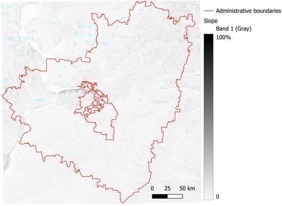 This attribute reflects the elevation difference in the site and is defined on a continuous percentage scale. A significant slope increases the costs of construction due to the need for extensive vertical planning. According to “SP 42.13330.2016 Urban Development. Planning and Development of Urban and Rural Settlements” [69], design elevations should be assigned based on minimizing excavation work, while also considering the use of displaced soils at the construction site. To create the slope map (Figure 2), data from the OpenTopography project [70] were utilized.
