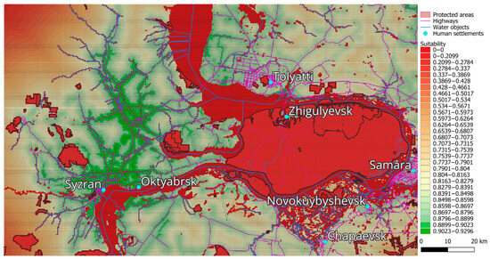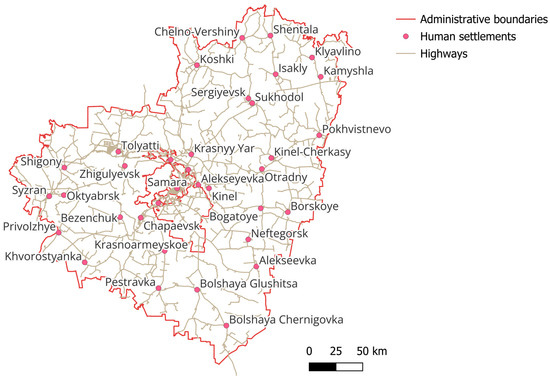 This attribute reflects the distance from the warehouse site to the nearest roads and is defined on a continuous spatial scale. The costs associated with building and operating the warehouse are directly influenced by this attribute. Specifically, the shorter the distance to highways, the lower the cost of constructing access roads to the site and the easier the delivery of construction materials. The relevant spatial data were sourced from a publicly available road map of the Samara region, Russia [70]. Data obtained from OpenStreetMap (OSM) provides spatially detailed, targeted, flexible, and reproducible information [72]. The term “Highways” here refers to roads suitable for freight transportation classified by OpenStreetMap as “primary,” “secondary,” “tertiary,” and “trunk.” The highway map of the Samara region is shown in Figure 3.