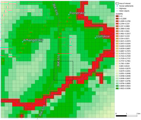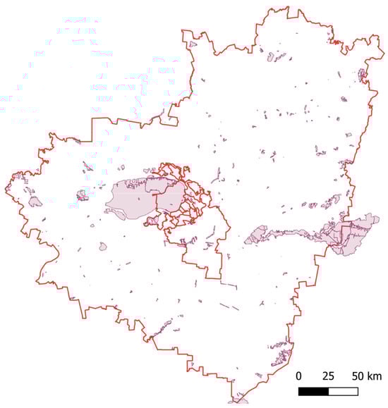 OpenStreetMap (OSM) contains a wealth of open geographic spatial data, including data on protected areas [78]. The constraint data expressed by attributes are taken from OpenStreetMap [78] and are shown in Figure 5. There are no national or dendrological parks in the study area, so attributes and are equal to 0 for all areas under consideration.