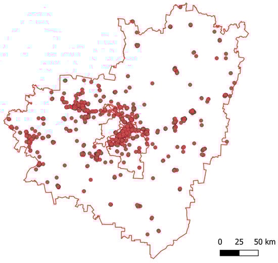 The average distance from the warehouse to the pick-up point is calculated using spatial data on the location of highways and the coordinates of the pick-up points. The distance is determined as the arithmetic mean of the distances from the warehouse site to the various pick-up points. The map showing the locations of the order pick-up points is presented in Figure 6. These data were also sourced from OpenStreetMap [78].