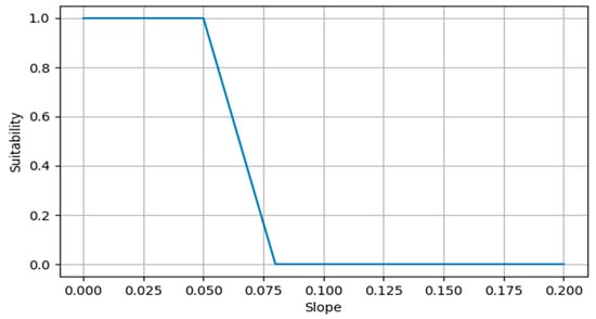 The criterion reflects the suitability of sites with varying terrain slopes for the placement of an e-commerce warehouse. Typically, for the construction of industrial facilities, including warehouses, the most suitable slope is around 5% [79], as it ensures proper drainage of surface water, eliminates marshy and flooded areas, and ensures stable access for freight transport. Based on this, sites with a slope ranging from 0% to 5% are considered fully suitable, while sites with a slope greater than 8% are considered completely unsuitable for warehouse placement. The relationship between site suitability and slope is illustrated in Figure 8.