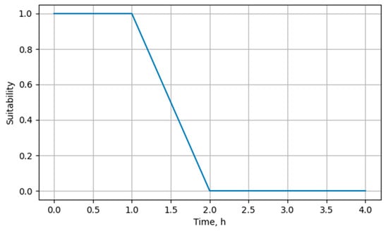 The criterion reflects the site’s suitability with respect to the attribute —average travel time. According to the DM, an average travel time of no more than 1 h is considered fully acceptable. In contrast, an average travel time of more than 2 h is deemed completely unacceptable. The corresponding suitability function is depicted graphically in Figure 10.