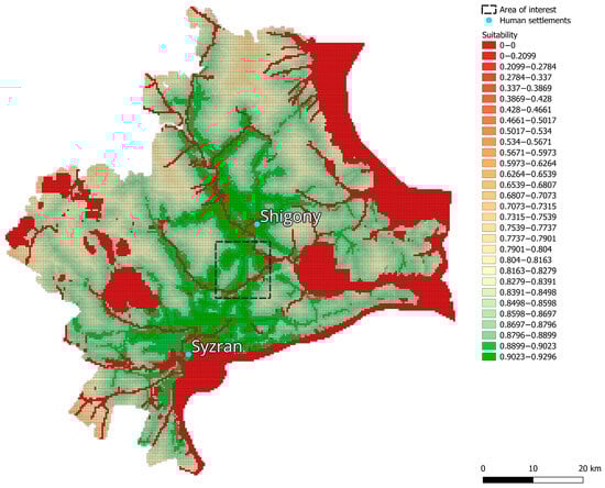The criterion represents the site’s suitability based on the attribute —distance to highways. According to the DM, sites located within 1 km of a road are considered fully suitable. Conversely, sites located more than 20 km from the nearest road are considered completely unsuitable. The relationship between site suitability and distance to roads is shown graphically in Figure 9.
