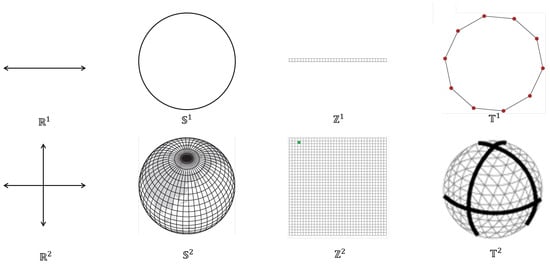 Various embedding spaces are listed in Table 1 that will, in some sense, permeate throughout this manuscript. Most readers will be familiar with and from a rudimentary study of high school algebra and geometry. These spaces represent the one-dimensional real number line and its cross product that embedding spaces typically used to express time () and localized geographic space (). When we consider the Earth’s geoidal surface, a different embedding space is needed. This embedding space is called , a sphericalized version of , fundamentally similar to the latitudinal and longitudinal reference on Earth. Similarly, we can consider a cyclic real line counterpart, namely . For example, if we treated the time of the year independent of the year, we would be addressing a space similar to , an approach often found in climatological graphics expressing changes in global mean temperature. Readers may not be as familiar with the discretized spaces and . Loosely speaking, these spaces discretize their counterpart spaces and . spaces can be thought of as a pixelation of spaces and, as such, are conceptually familiar in some sense to anyone with a background in digital raster imagery. spaces similarly represent the pixelation of spaces and are thus fundamentally less familiar to readers who have never worked with technologies such as spherical screens. A basic representation of the eight spaces is shown in Figure 1.