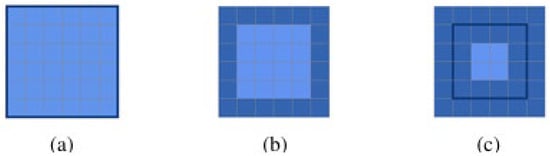 Three different ways to characterize a boundary in a discretized plane [,]: (a) the space between the interior and exterior pixels []; (b) the pixels belonging to an object, but adjacent to the exterior []; and (c) a hybrid of the two where pixels astride the boundary identified in (a) are highlighted as inner and outer margins [].
