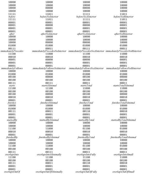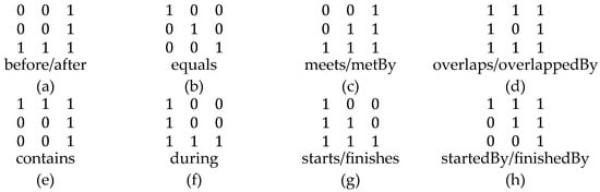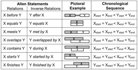 Allen’s interval algebra [] considers the relationships between the starting and ending points of two objects. The sequence of the points in question defines the relation between the intervals. Allen identified 13 plausible sequences for the four points (Figure 3), collapsible into seven groups.