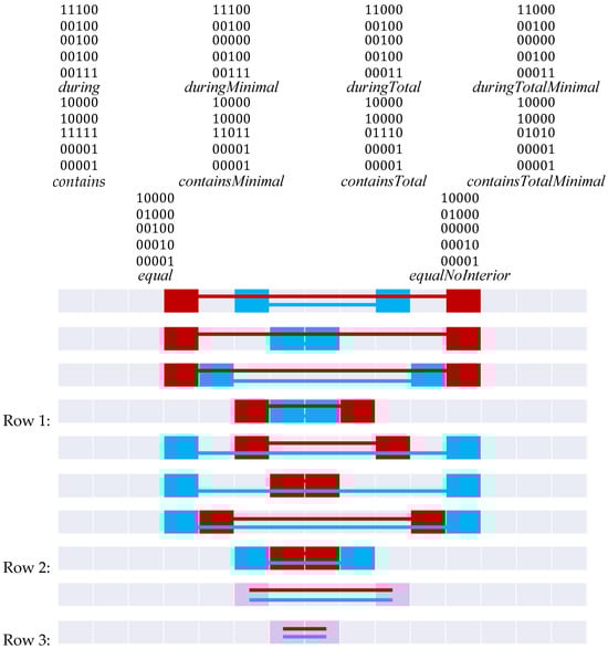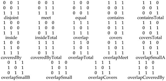 Using the 9-intersection, intervals in can also be studied, removing the ordering principle from Allen’s interval algebra. If we consider the pictorial representations in Figure 3, we can assess definitively the 9-intersection matrices associated with them. These are shown in Figure 4. Interestingly, contains and during form two separate 9-intersection relations.