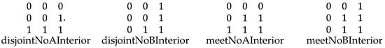 The interior, boundary, and exterior of an object form the vocabulary for the 9-intersection matrix []. The 9-intersection matrix (Equation (1)) considers the intersection between these topological components of two such objects A and B in a pairwise manner.
