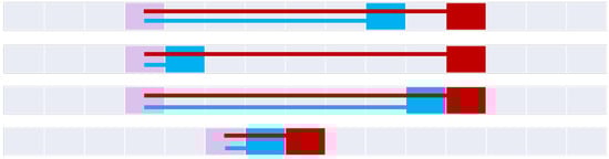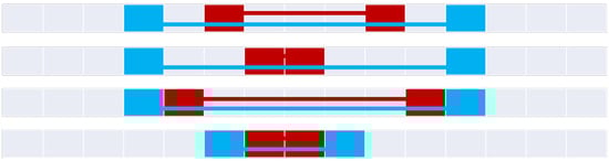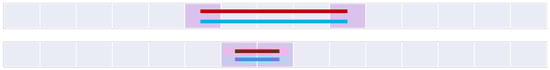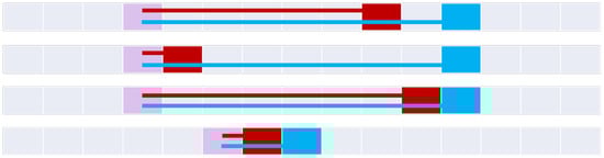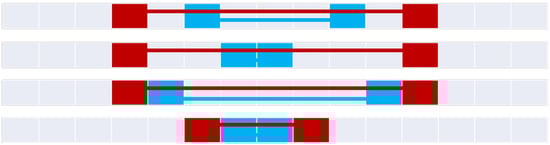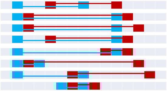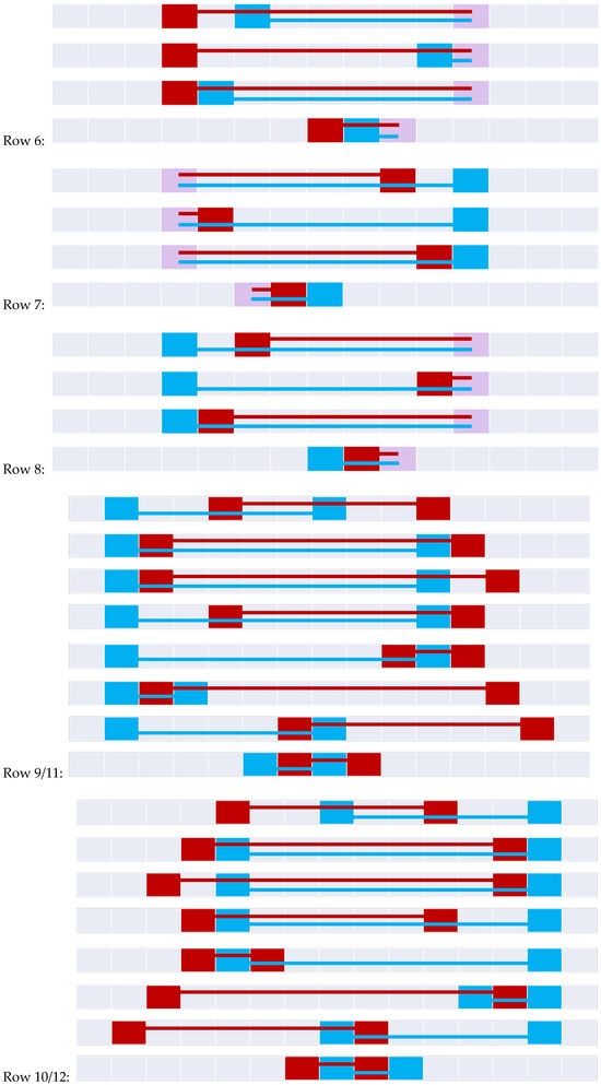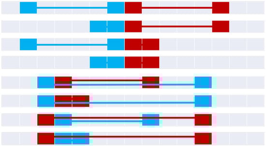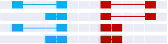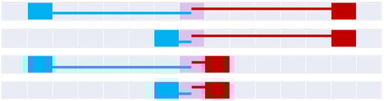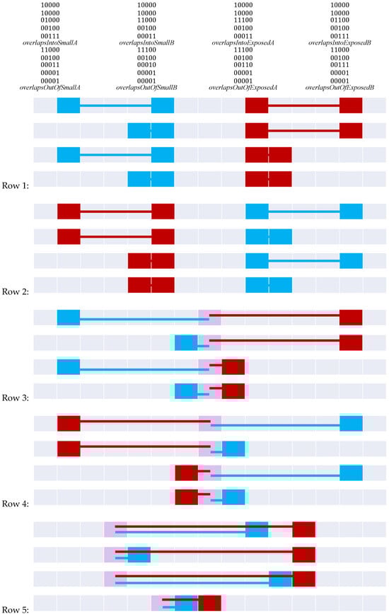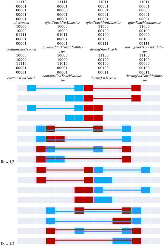 Figure 20 constructs the 9+-intersection [] for each of the bifurcated asymmetric relations found in Figure 11, Figure 12, Figure 15, Figure 16 and Figure 18. The rows of the figure are paired, namely each odd row considers A interacting with B’s before exterior and its start, while the even rows show A’s interaction with B’s after exterior and its end where applicable. Visible representations are shown beneath the table, representing horizontal flips of the corresponding Figure 11, Figure 12, Figure 15, Figure 16 and Figure 18. This transformation is made possible by recognizing that there are two distinct versions of the ordering relations that govern these relations from Allen’s interval algebra [], as shown in Figure 3. The name of each relation is derived from Allen’s interval algebra relation that corresponds semantically to the relation [].