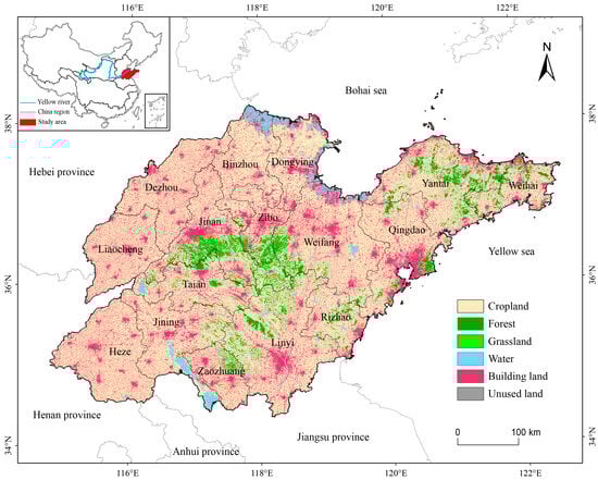 Shandong Province (34°23′–38°24′ N, 114°48′–122°42′ E) is situated in eastern China along the coast of the Bohai Sea and the Yellow Sea. It features diverse land utilization patterns, including plowable land, woodland, grassy field, water bodies, building plots, and unimproved land (Figure 1). The research field has a temperate monsoonal zone with features hot, precipitation-heavy summers and cold, desiccated winters with a yearly mean temperature of 13–15 °C and precipitation spanning from 600 to 1000 mm. As a key province in China’s eastern ecological security strategy, Shandong provides an optimal environment for agricultural and forestry development due to its favorable climatic conditions. In terms of terrestrial carbon fluxes, the province’s diverse ecosystems play a significant role as a carbon sink due to its extensive forested area, agricultural land, and grassland. At the same time, the increase in construction land leads to an increase in carbon sources, all of which contribute to the carbon cycle. The role of continental ecosystems is critical in mitigating carbon emissions and carbon neutrality goals, ensuring regional ecological security while offering practical insights for nationwide ecological conservation and climate change mitigation strategies [].