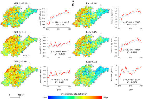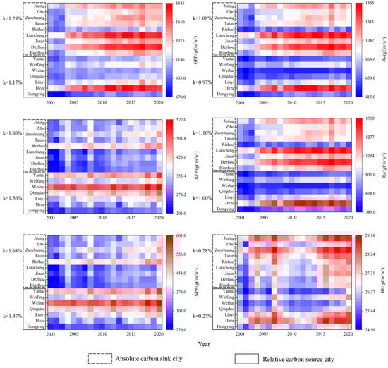 Shifts in the spatiotemporal allocation of carbon flux sources and storage zones in land ecosystems of Shandong Province, 2001–2020. Note: k denotes the average growth rate in gCm−2a−1.