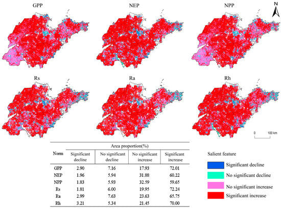 Within the duration of the study, the spatial variations in carbon sinks and sources of continental ecosystems in Shandong Province exhibited similar trends. Specifically, this manifests as “a significant increase in most areas, with scattered distribution in the rest.” The areas where both carbon sinks and sources increased were significantly greater than in cases where they decreased. The percentage of zones with significant increases in GPP, NEP, and NPP accounted for 72.01%, 59.65%, and 60.22%, respectively, while the proportion of areas with significant decreases was 2.90%, 1.83%, and 1.96%. Similarly, regions experiencing substantial increases in Rs, Ra, and Rh accounted for 72.24%, 65.75%, and 70.00%, respectively, while regions experiencing substantial decreases accounted for 1.81%, 2.99%, and 3.21%. The regions of increase were distributed across the entire province, whereas the regions experiencing a decline were primarily concentrated along the eastern coast, northeastern inland, and southwestern regions (Figure 3).