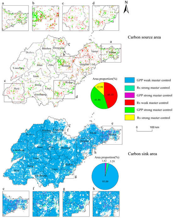 Shandong Province generally exhibits a distribution trend characterized by being a major carbon sink with some carbon sources. Carbon sink areas account for 92.46% of Shandong Province’s total area and are widely distributed throughout the province. Carbon source areas account for 7.54% of the total area and are mainly distributed in the southwestern inland and eastern coastal regions. Derived from the assessment of the dominant control patterns of carbon emitters/reservoirs, in carbon source areas (θNEP < 0), the area controlled by strong Rs was the smallest, accounting for 12.99%, and it was scattered across the province. Areas with weak Rs control and strong GPP control accounted for 45.15% and 41.86%, respectively, and they were distributed in the eastern coastal cities, the southwestern region, and northeastern cities (Figure 5a–d). Overall, in carbon sink areas, GPP was the dominant control factor, widely distributed throughout the province. In contrast, in carbon source areas, Rs and GPP jointly controlled the carbon dynamics, with a concentration in the eastern coastal and southwestern inland cities. In carbon sink areas (θNEP > 0), areas with weak GPP control accounted for 95.09%, followed by areas with strong Rs control, which accounted for 3.29%. These regions were mainly distributed in the eastern coastal and central areas, while areas with strong GPP control accounted for the smallest proportion, only 1.62%, and were scattered (Figure 5e–h).