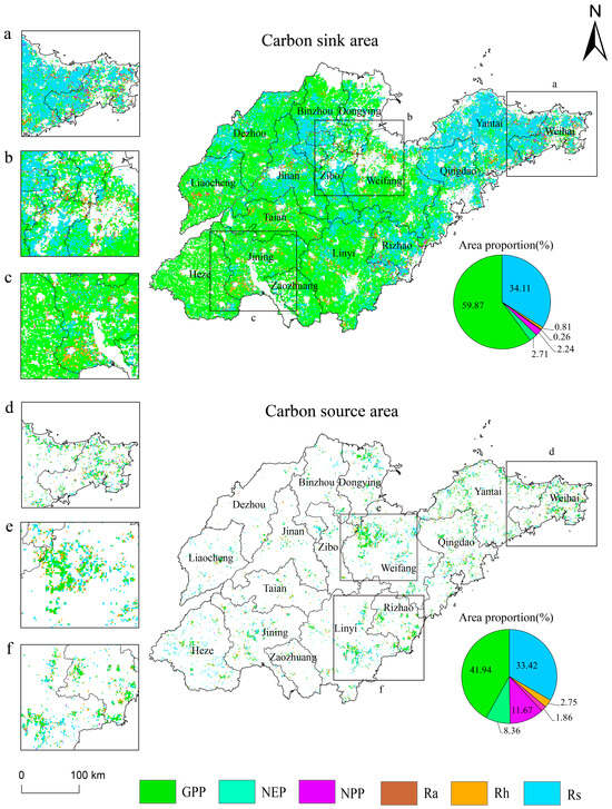 According to the findings from the primary governing patterns, this study further identified the dominant control indicators for carbon source/sink areas in the continental ecosystems of Shandong Province. The data support the notion that the largest proportion of areas is controlled by GPP, accounting for 59.87% in carbon sink areas and 41.94% in carbon source areas. The second largest proportion is controlled by Rs, accounting for 34.11% and 33.42%, respectively, in the two areas, with other factors having smaller proportions. GPP-controlled areas expand spatially from west to east, while Rs-controlled areas are concentrated in the eastern coastal and central zones (Figure 6a–c). In carbon sink areas, GPP- and Rs-controlled regions account for 64.82% and 35.18%, respectively, suggesting that vegetation carbon storage in these areas is constrained due to respiration under the dominance of photosynthesis. Rs is the most significant controlling factor in carbon source areas, covering 41.94% of the region, and it is scattered from the northwest to the southeast across the province. GPP is the second most dominant factor, covering 38.03%, and it is mainly distributed along the eastern coastal cities and the northwest part of Weifang. Ra and Rh cover 11.67% and 8.36%, respectively, and are scattered in areas where Rs dominates (Figure 6d–f). In carbon source areas, the regions controlled by carbon sink and carbon source indicators account for 38.03% and 61.97%, respectively, indicating that carbon storage in these areas is primarily dominated by respiration.