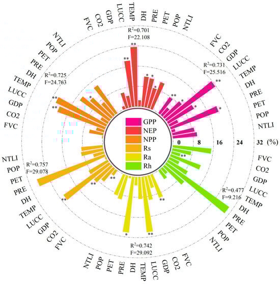 The regression equations between various indicators and driving factors yielded R2 values spanning from 0.477 to 0.757, with F-values spanning from 9.216 to 29.092 in the analysis of variance. These results indicate a good fit, with the regression equations being statistically significant. Among the carbon sink indicators, the dominant driving factors for GPP were land-use change and precipitation, contributing 23.71% and 20.15%, respectively. The dominant driving factors for NEP and NPP were temperature and land-use change, with contribution rates of 23.60% 22.01%, 18.39%, and 20.02%, respectively. For the carbon source indicators, the dominant driving factors for Rs and Ra were precipitation and land-use change, contributing 28.65%, 22.15%, 22.22%, and 22.00%, respectively. Precipitation was the dominant driving factor for Rh, with a contribution rate of 30.47% (Figure 7).