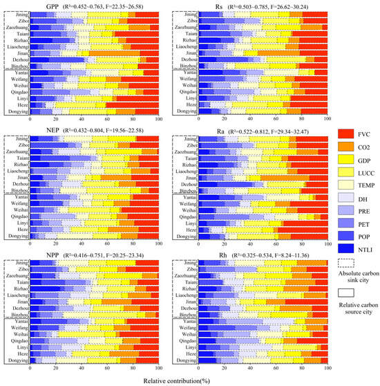 For different cities, the regression equations between various indicators and driving factors yielded R2 values ranging from 0.325 to 0.812, with F-values between 8.24 and 32.47, indicating the statistical significance of the regression equations. In cities with absolute carbon sinks, the dominant driving factor for all indicators in Binzhou and Dezhou was land-use change, with contribution rates ranging from 21.20% to 36.94%. In Rizhao and Tai’an, the carbon sink indicators were primarily driven by vegetation coverage and land-use change, while the carbon source indicators were driven by vegetation coverage and atmospheric CO2 concentration. In Jinan and Zaozhuang, each indicator was mainly controlled by a single factor, namely atmospheric CO2 concentration and GDP, contributing 23.26–36.59% and 17.83–29.61%, respectively.
