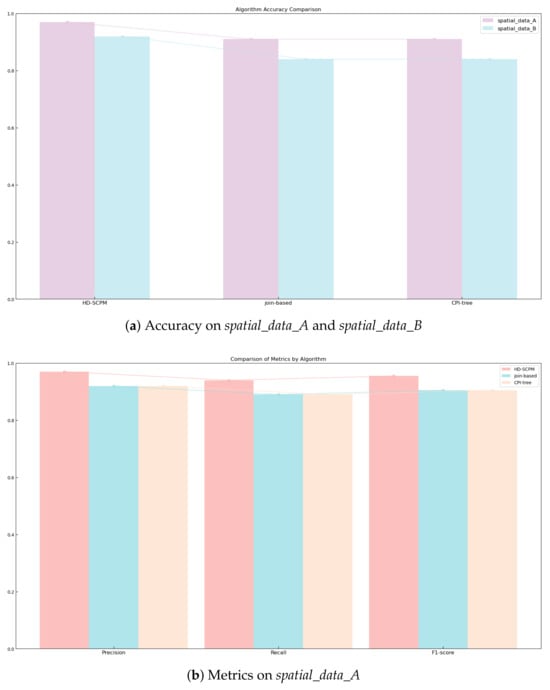 Pattern mining accuracy comparison across different datasets. (a) Accuracy of the three algorithms on spatial_data_A and spatial_data_B. (b) Precision, recall, and F1-score on spatial_data_A. (c) Precision, recall, and F1-score on sample_spatial_data.