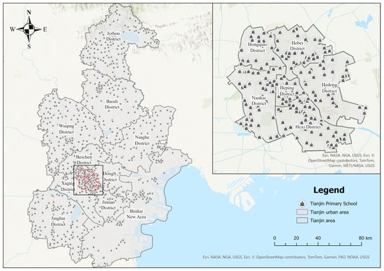 This study selects Tianjin as the study area. According to the Seventh National Population Census, Tianjin has a permanent population of 13.87 million. The city comprises 16 districts, including the six central districts (Heping, Nankai, Hebei, Hedong, Hexi, and Hongqiao), four suburban districts (Beichen, Jinnan, Xiqing, and Dongli), five outer suburban counties (Jizhou, Baodi, Wuqing, Ninghe, and Jinghai), and the Binhai New Area, as shown in Figure 1. Covering a total area of 11,966.45 km2, Tianjin hosts 895 primary schools with an annual enrollment of 157,700 students and a total student population of 700,000. The population aged 0–14 is 1.868 million, and the 5–14 age group numbers approximately 1.259 million.