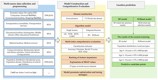 This study involves three main steps: (1) Multi-source data collection and preprocessing, constructing a primary and secondary indicator system for educational facility siting. Seventeen types of data—such as healthcare services, dining, and transportation—were collected and partially analyzed for correlation. (2) Model construction and evaluation, where multiple machine learning algorithms were compared and assessed. The best-performing ensemble model was then used to rank feature importance, further quantified using SHAP (SHapley Additive exPlanations). (3) Prediction and site selection, involving initial suitability analysis, comparison with existing educational facilities, and identification of priority areas through secondary filtering based on the population of school-aged children (aged 5–14) and school-to-population ratios. A final recommendation was made based on the combined outputs of RF and XGBoost models. The research framework is illustrated in Figure 2.