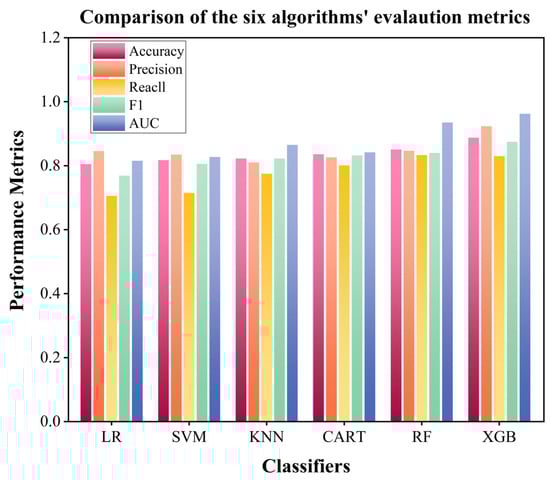 After model construction and training, to comprehensively and objectively evaluate the performance of each classification algorithm in predicting the suitability of primary school site selection, this study used five core metrics: Accuracy, Precision, Recall, F1 score, and AUC. As shown in Figure 3, ensemble learning algorithms represented by RF and XGBoost generally outperformed the four single learners (LR, SVM, KNN, and CART). Quantitative evaluation showed that the average values of overall performance metrics (Accuracy/Precision/Recall/F1/AUC) for single learners were around 0.80, while all metrics for ensemble learners exceeded the 0.80 threshold. Specifically, the accuracies of RF and XGBoost were 0.851 and 0.888, respectively. In terms of Precision, F1 score, and AUC, XGBoost slightly outperformed RF; however, RF showed a marginally higher Recall than XGBoost.