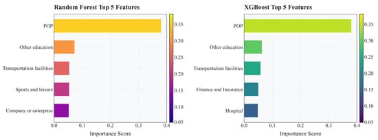 Feature importance analysis shows that the tuned models more accurately identify key influencing factors: population density, transportation facility services, and the distribution of other educational institutions receive significantly higher importance scores (Figure 4). This finding aligns with the SHAP-based interpretation results (Figure 5), further validating the interpretability of the optimized models.