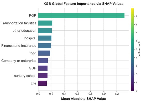 Given that XGBoost exhibits relatively superior overall performance in key evaluation metrics, such as precision (0.924) and AUC value (0.962), it establishes a more robust model foundation for mechanism analysis. While the feature importance rankings of Random Forest (RF) and XGBoost are highly consistent—identifying population density, other educational institutions, and transportation facilities as the top three features—XGBoost demonstrates distinct advantages in quantifying the directional contributions of features and capturing non-linear interaction effects. This capability is essential for elucidating the spatial collaborative configuration mechanism of the “15 min living circle.” To further interpret the predictive outcomes of the XGBoost model, this study employs a game theory-based SHAP method (Figure 5) to systematically quantify the contributions of various features to the suitability scores for primary school site selection. The analysis shows that the mean SHAP value of population density (POP) is 1.320, significantly higher than other factors, highlighting the core role of the spatial matching principle between population and educational resources in public facility planning. This clearly reflects that the distribution of school-age population fundamentally constrains educational resource allocation.