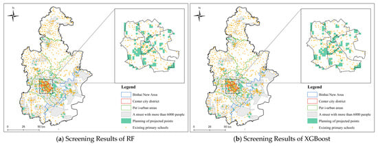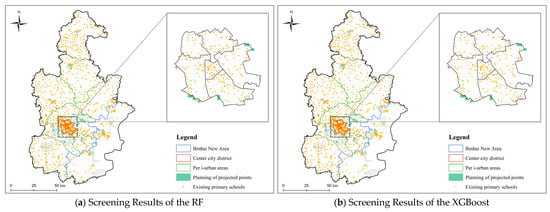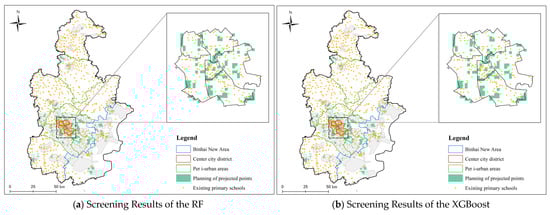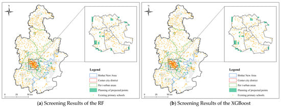 Following the steps described above, the trained RF and XGBoost models were applied to primary school site selection, yielding preliminary prediction results. During the model discrimination process, the prediction probability threshold was set at 0.5. That is, if a certain grid point was predicted by the model to have an appropriate probability greater than 0.5, it was regarded as a “suitable” location point; otherwise, it was classified as “unsuitable”. This threshold selection followed the commonly used standard for binary classification tasks [26]. The RF model identified 16,946 suitable grid points, while the XGBoost model identified 19,403. These results represent initial predictions; actual planning requires secondary screening combined with factors such as population distribution and land use types.