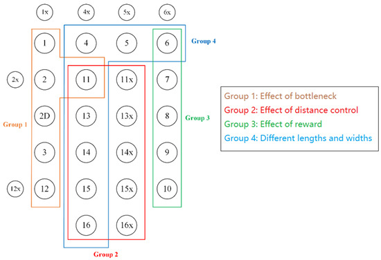In this subsection, we present the results of case study about methodological application of ICLV. To facilitate the comparison between the ICLV models and standard logit models, we analyze four experimental groups based on distinct decision-making mechanisms. As shown in Figure 3, Groups 1, 2, and 3 examine the effects of bottlenecks, distance control, and extra rewards, respectively, while Group 4 focuses on variations in route length and width. Note that in our previous paper about the typical Logit models [3], we had used the same four groups to study the influence of controls. And in this paper, to clarify the advantage of ICLV models, we want to directly compare the results between Logit models and ICLV models. Therefore, we consider the same groups for a better comparison.