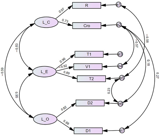 Following adjustments based on Modification Indices, the results for Group 1 (Bottleneck group) are presented in Table 5 and Figure 4. To clearly differentiate latent variables from observed indicators, we prefix latent variables with “L-”. Specifically, Group 1 includes the latent variables L-R1B (Route 1 with Bottleneck), L-R2 (Route 2), and L-O (Occupancy).