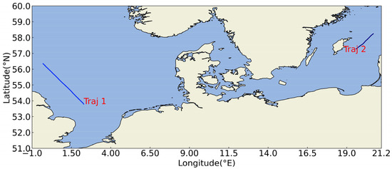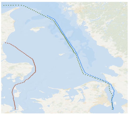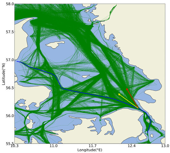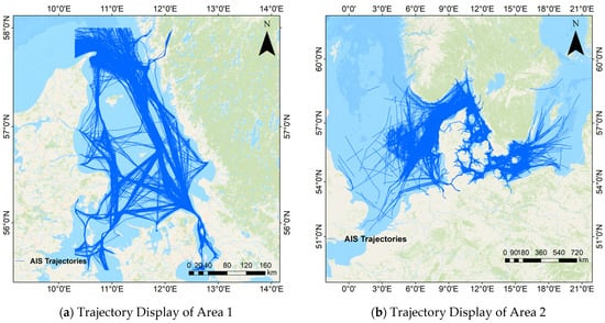 The dataset information is shown in Table 1. The first dataset is the data of the Danish area open-sourced by https://github.com/CIA-Oceanix/TrAISformer (accessed on 1 September 2025). The other dataset is obtained by downloading from the official website of the Danish Maritime Authority and preprocessing. Both datasets contain AIS data of cargo ships and tankers. For the former dataset, the time range is from 1 January 2019 to 31 March 2019, and the regional range is from (, ) to (, ). The data from 1 January to 10 March are used as the training set, the data from 11 March to 20 March are used as the validation set, and the remaining data are used as the test set. In total, the data contain 13,679 ship trajectory data points. For the latter dataset, the time range is from 1 September 2023 to 29 February 2024, and the regional range is a rectangular area from (, ) to (, ). The data are randomly divided into a training set, a validation set, and a test set at a ratio of 8:1:1. In total, the data contain 78,647 ship trajectory data points. For the convenience of description, the former dataset is called Area 1 and the latter is called Area 2. The data preprocessing method refers to [22]. The data of the two areas are shown in Figure 9. The preprocessed trajectory points are shown in Figure 10, where we have selected three trajectories and distinguished them with different colors.