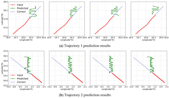 In the result display, all models with the Transformer architecture use eight-layer Transformer blocks, and each layer uses eight-head attention. The unit grid size for longitude and latitude is , the unit of sog is 1 knot, and the unit of cog is . The embedding lengths corresponding to each unit are 256, 256, 128, and 128, respectively. The discretization of continuous values will inevitably lead to a loss of precision. Within the training area, after dividing the latitude by 0.01°, the length of the corresponding grid is approximately 1.11 km; after dividing the longitude by 0.01°, the length of the corresponding grid ranges from approximately 0.56 km to 0.7 km. Therefore, the maximum theoretical error caused by precision loss is about 0.65 km. Although information loss exists, this granularity is acceptable for our long-term prediction task. The length of the input historical trajectory is 3 h, and the future trajectory for 15 h is predicted. We train our model on a single NVIDIA A10 GPU. For the training of the model in Area 1, it takes about 1 h, while for the model in Area 2, the training takes about 9 h. The differences in training times between the two regions are mainly due to the following reasons: First, the number of trajectories in Area 2 is nearly six times that of Area 1. With the increase in data volume, the model also requires more training epochs to converge. Second, since the scope of Area 2 is larger, its latitude and longitude embedding vectors will also increase, which in turn leads to an increase in the number of model parameters.