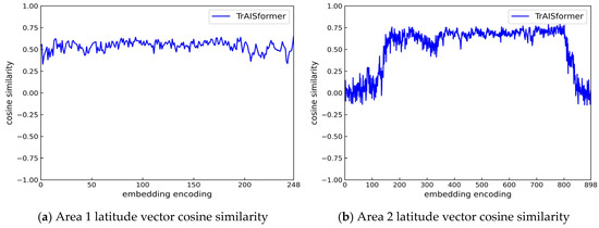 Moreover, in the embedding layer of the model, due to the insufficient distribution of training data in some areas, the embedding vectors corresponding to these areas are not well trained. This is clearly shown in Figure 4. The y-values in the figure are the cosine similarities calculated from the latitude vectors that are adjacent in the real world within the latitude vector space. For the previous area where there is a sufficient amount of data in the training scope, the vectors corresponding to the adjacent latitudes have relatively high cosine similarities. However, for the latter area, because there is a lesser amount of trajectory data at some positions, the cosine similarities of some adjacent latitude embedding vectors are close to 0. This is also the reason why the model performs poorly in predicting areas with sparse trajectories, as the model does not understand the actual meanings of the position vectors corresponding to these areas.