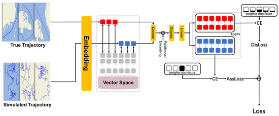 After the real trajectory and simulated trajectory as inputs are mapped to the vector space through embedding, they will be added to the positional encoding. The obtained vector containing positional information will be input into the Blocks layer, which includes masked multi-head self-attention and Feed Forward Network (FFN) layers. For the input sequence vector , the first step is to transform it into through three transformation matrices: