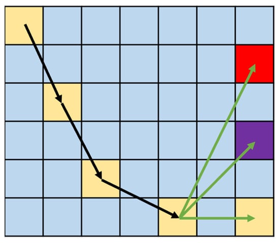 In this formula, denotes the number of samples, denotes the number of categories, represents the true probability distribution, and represents the predicted probability distribution. In text generation, one-hot vectors are used as the category distribution mainly because of the mutual exclusivity between words in the vocabulary. However, the probability distribution of the output vocabulary learned by the model does not always result in a unimodal probability distribution like a one-hot vector; instead, it may produce multiple possible alternative words. However, such a weight distribution cannot be predefined by us and must be learned by the model itself. In trajectory prediction, Figure 7 illustrates possible prediction scenarios. The black line represents the input trajectory, the green lines represent possible predicted results, and the yellow points represent the true trajectory points. Among the multiple predicted results in the figure, the best prediction is naturally the true result, followed by the closer purple position, and the worst is the farthest red position. Therefore, the closer the predicted result is to the true result, the smaller its loss should be. Thus, in the cross-entropy function, predicted classes that are closer to the true class should have a higher output probability. We can achieve this goal by modifying the true class distribution.