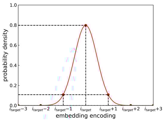 For the new true category probability distribution, we adopt a normal distribution to obtain the weights corresponding to each category. Figure 8 shows this probability distribution. In this figure, the weight corresponding to the true embedding encodings is 0.8, the weights corresponding to two adjacent embedding encodings are 0.1 each, and the weights of the remaining parts are still close to 0. The reason for this distribution is that the current grid cells are approximately 1 km in both length and width. Including additional adjacent areas would result in excessive prediction errors. By modifying the true category distribution in this way, the model can consider nearby points of the true position as potential alternatives during the prediction process, thereby enhancing the model’s generalization ability.