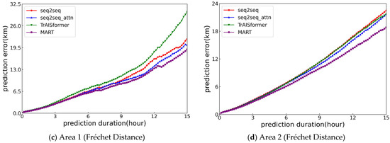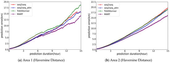We compared MART with different trajectory prediction models, including seq2seq [20], seq2seq_attn [21], and TrAISformer [22]. To ensure the input formats were as consistent as possible, we added embedding layers to all tested models. All models were evaluated in two areas, and the experimental results are presented in Figure 11. In these figures, we use the same symbols to represent the prediction results of the same model in different regions, and the error values are calculated using the evaluation criteria proposed above. Table 2 shows the prediction errors of each model at the fifth, tenth, and fifteenth hours in both areas. In these two areas, the MART model outperformed all other models. When the Haversine distance was used as the evaluation metric, it achieved a 9.5% higher accuracy than the second-best model in the 15 h prediction task for Area 1, and a 15.4% accuracy improvement in the same prediction task for Area 2. In tests across multiple time intervals and different areas, the average error of this model was reduced by approximately 10–15%. When the Fréchet distance was adopted as the evaluation metric, the prediction errors of all models increased further; however, the MART model still remained the optimal one. Specifically, it achieved a 5.5% accuracy improvement in Area 1 and an 11.7% accuracy improvement in Area 2. In tests spanning multiple time intervals and different areas, the average error of this model was reduced by approximately 5–12%. From the above comparison results, it can be seen that the MART model achieved better performance both in the prediction of trajectory points at a single moment and in the fitting of the entire trajectory, which further proves the effectiveness of the AssLoss and DisLoss modules.