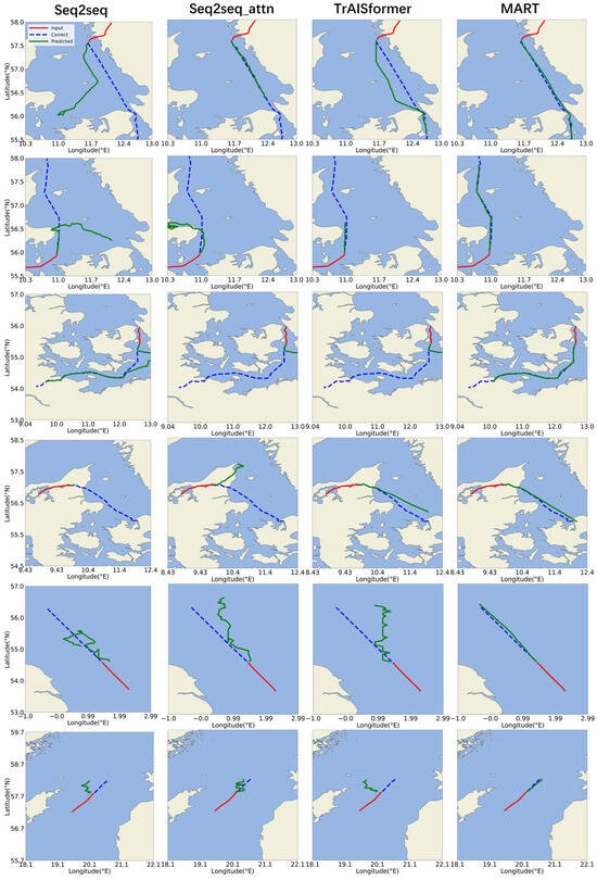 In the trajectory prediction for narrow waterways and tortuous routes, the MART model can always fit the trajectory route well and make timely direction changes; and even for some trajectories that cannot be fully fitted, it always moves along the course of the real trajectory. This indicates that the model has an accurate understanding of the trajectory destination. In contrast, other models sometimes fail to identify the destination clearly, which leads to the phenomenon of stagnation or wandering in the predicted trajectories.