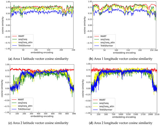 From the similarity graph of the longitude and latitude vector space in Area 1, it can be seen that the vectors corresponding to adjacent position embedding encodings always have a high similarity. In Area 2, except for the MART model, other models cannot learn the spatial vectors of these areas sufficiently due to the small number of trajectories in the marginal areas. As a result, the similarity of the adjacent embedding vectors in these areas is low, which is also the reason why the other models perform poorly in predicting the test trajectories as shown in Figure 12. By adding simulated trajectories, we enable MART to fully learn and understand the position vectors of all areas in the space, so the similarity of adjacent vectors is always high.