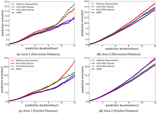 To demonstrate the improvement of each method on the prediction effect, we conducted ablation experiments and the results are presented in Figure 14 and Table 5. As can be seen from the table, compared with the original model, when the Haversine distance is used as the evaluation metric, the DisLoss method has improved the prediction effect in both regions. However, when the Fréchet distance is used instead as the evaluation metric, the improvement effect of DisLoss decreases significantly, and in Area 2, the performance after improvement is even worse than before. The AssLoss method shows the opposite trend: in Area 1, when the former (Haversine distance) is used as the evaluation metric, the AssLoss method achieves better prediction performance within 10 h, but its prediction effect is worse than that of the original model after 10 h. Nevertheless, when the evaluation metric is switched to the latter (Fréchet distance), the error variation of AssLoss is relatively small, and it outperforms the original model in both regions. The MART model, which integrates these two improvement methods, combines the advantages of both: it not only achieves accurate single-point prediction but also performs well in fitting the overall trajectory. This result not only proves the effectiveness of these two improvement methods but also strongly indicates that providing the model with the correlation between attributes and the distance information between attribute values can indeed help the model achieve better prediction results.