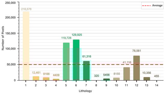 Total pixel count for each of the 14 lithological classes. See Table 3 for lithology class descriptions.