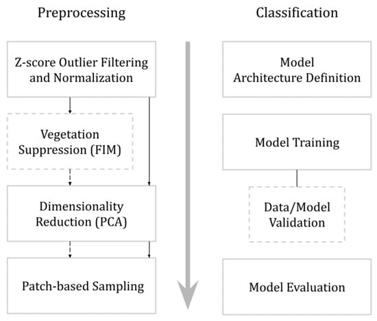 Data processing flowchart. Solid boxes and arrows represent mandatory steps in the pipeline. Dashed boxes indicate optional or iterative processes. The dashed ‘Vegetation Suppression (FIM)’ box is an optional step, illustrating the two parallel workflows for the original (bypassing FIM) and the FIM-modified datasets.