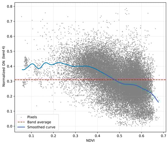 The Forced Invariance Method involves preprocessing the data by applying dark pixel correction, subtracting the smallest DN (Digital Number) value pixels from all pixels in each band to correct atmospheric path radiance and sensor calibration offsets. The vegetation index calculation is the second step, NDVI (Normalized Difference Vegetation Index) by default, used to plot against each band on a scatter plot (Figure 6). Average DN values represent the trend over NDVI categories, which is described with the best fitting curve. Median and mean filters are suggested by the authors of the FIM study [28] for curve fitting. With the known connection between the band values and the NDVI trend, the curve can be flattened with the following equation [28]: