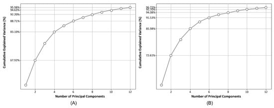 Dimensionality reduction involved 73 input features. These features included 72 bands from the satellite time series (6 dates × 12 bands per date) and one band from the SRTM. The criterion for selecting the number of principal components (PCs) was the cumulative explained variance (Figure 7), which explains the retained variability of each principal component. The first 12 principal components were selected for both the original (A) and decorrelated (FIM) datasets. This number of components accounts for a very high percentage of the total data variability in both scenarios: 95.98% for the original dataset and 96.72% for the FIM-processed dataset.