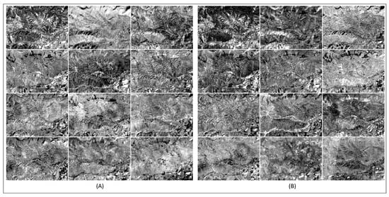 The first 12 principal components (bands) for the (A) original dataset and the (B) decorrelated dataset (UTM N34Z).